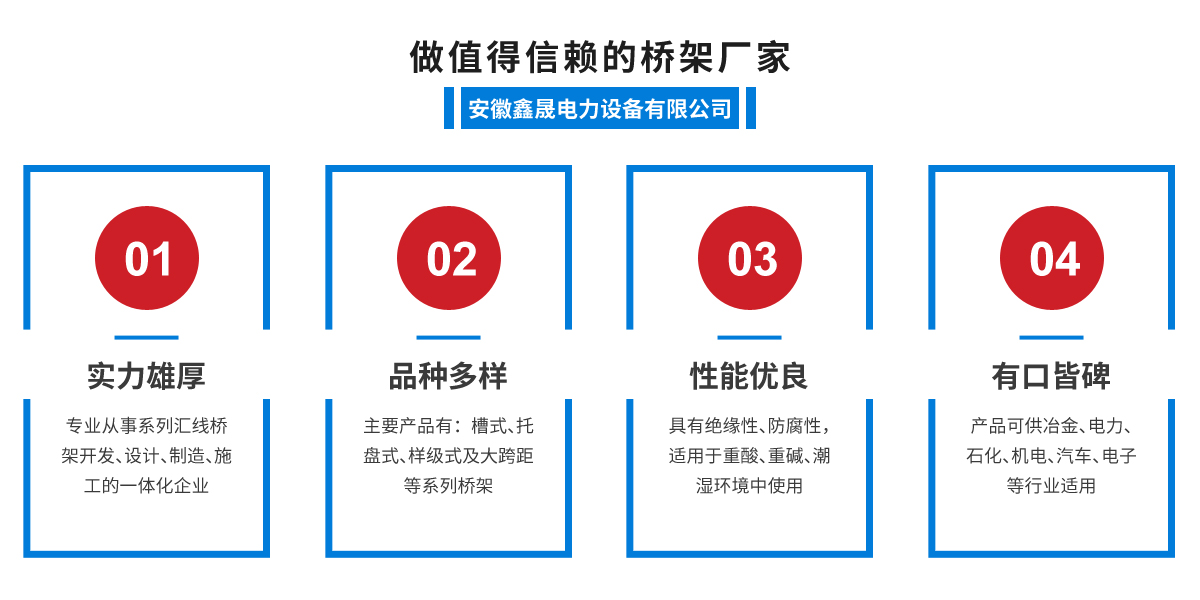 安徽鑫晟電力設備有限公司是專注從事系列匯線橋架開發、設計、制造、施工的一體化企業,主要產品有:槽式、托盤式、梯級式及大跨距等系列橋架。產品選用冷軋或熱軋鋼板井對...